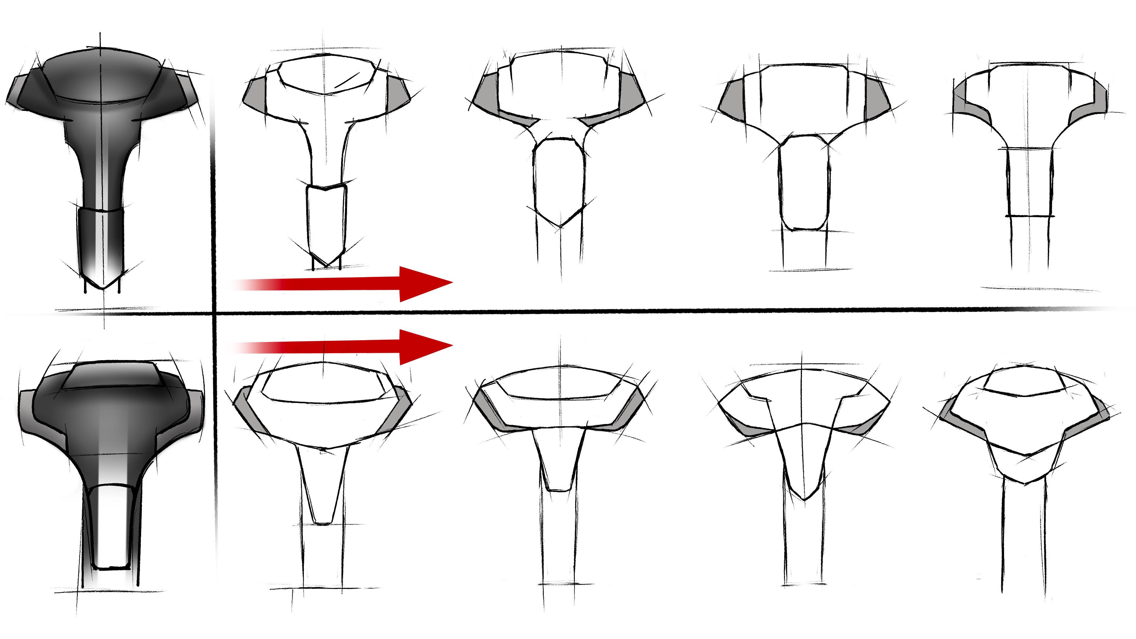 Nach dem allg. Brainstorming wurden vier Entwürfe ausgewählt, um von diesen weitere Untervarianten zu bilden. Basierend auf KI-Testvisualisierungen wurde darauffolgend begonnen, den Griff in CAD zu modellieren.