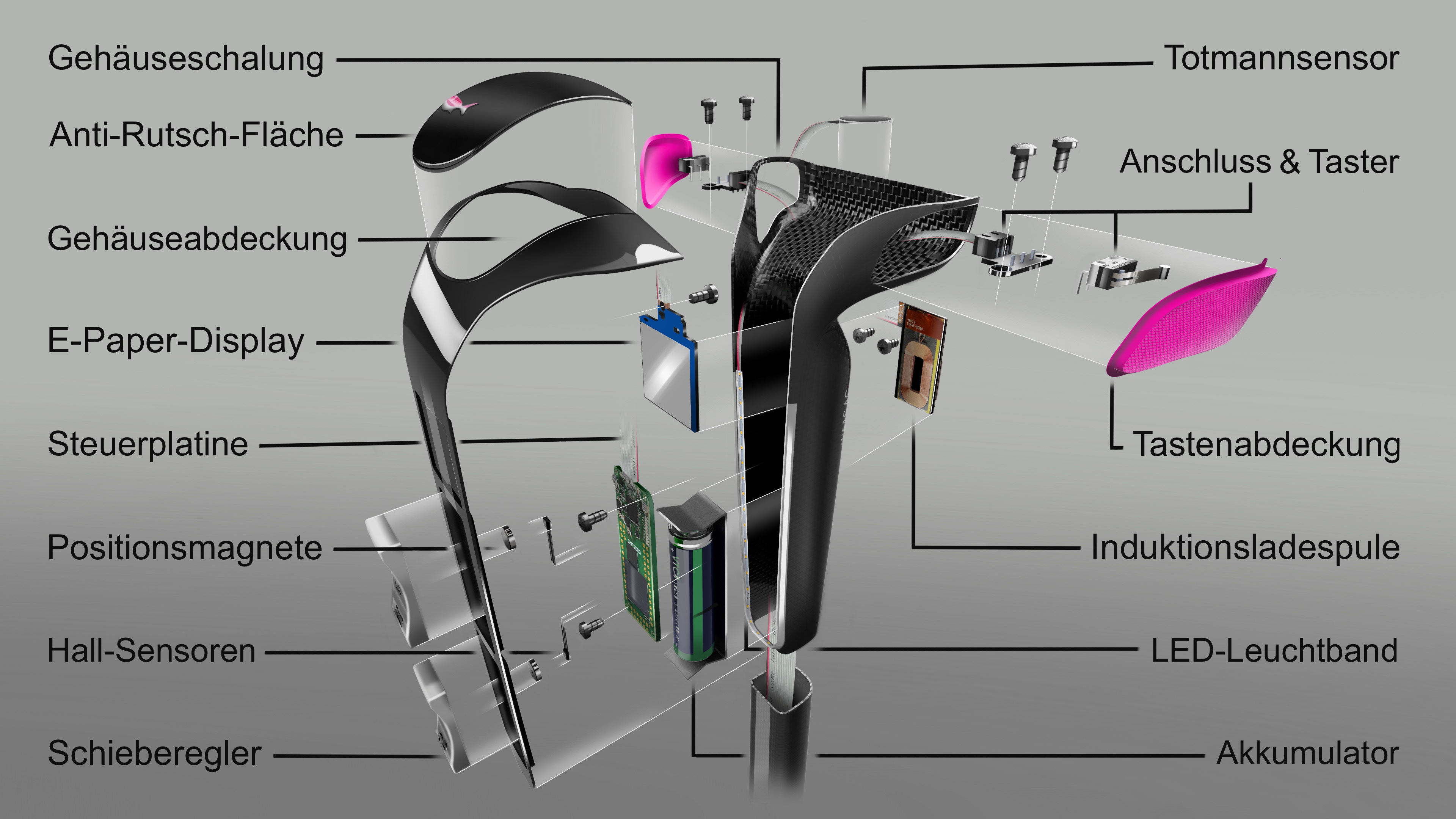 Der endgültige Funktionsprototyp ist soweit optimiert, dass er auch bei kleineren Menschen ideal in der Hand liegt. Um ein realistischen Eindruck von der Bedienung zu erhalten, lassen sich die einfach zu erreichenden Schieberegler mit leichtem Widerstand verstellen. Die seitlichen Tasten zur Lenkunterstützung sind aus gummiartigem TPU gedruckt und daher nachgiebig.