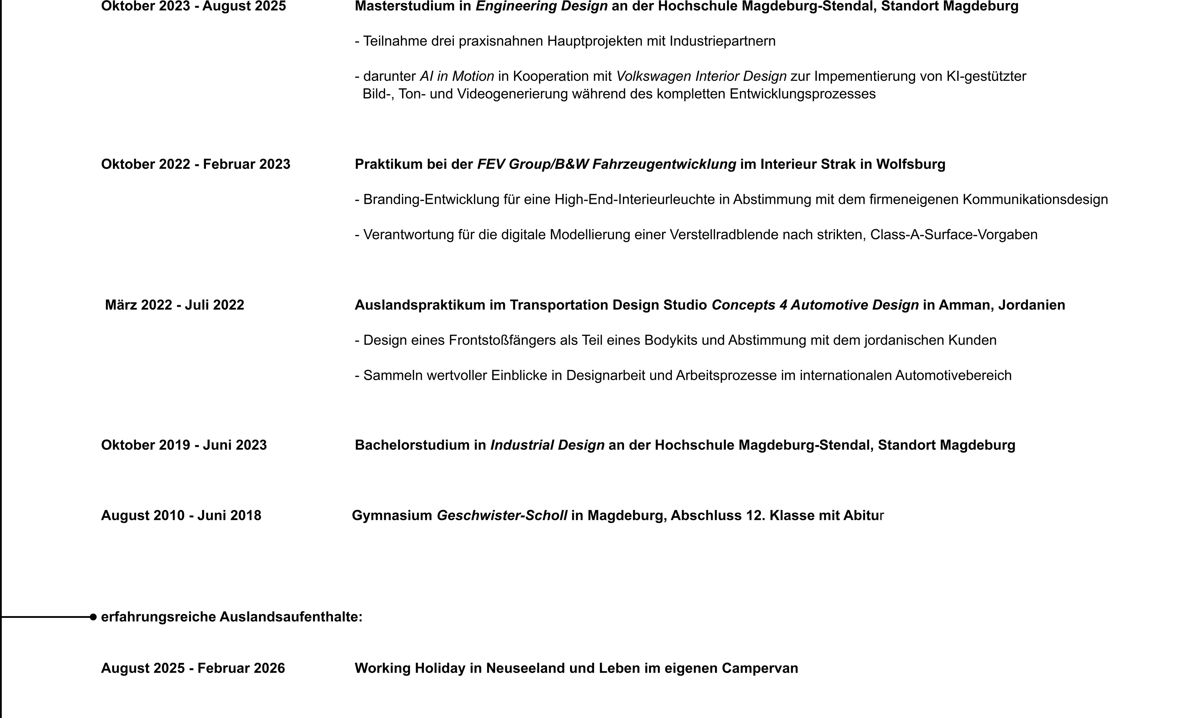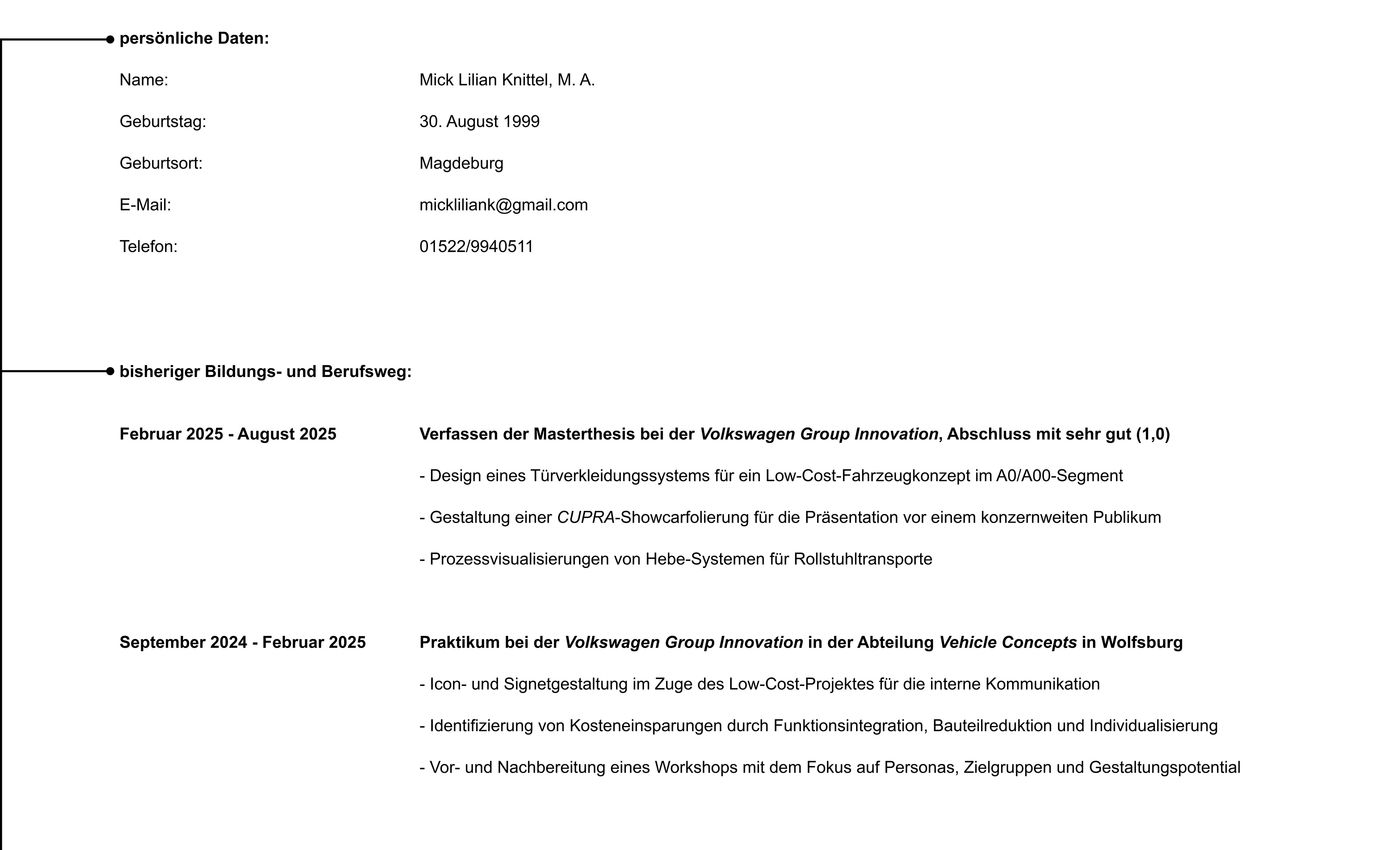 Ich bin Mick Knittel, geboren und aufgewachsen in Magdeburg. Die Kreativität begleitet mich schon seit vielen Jahren mit großer Begeisterung. Mein Bachelorstudium in Industrial Design absolvierte ich an der Hochschule Magdeburg-Stendal erfolgreich 2023. Ebenda vertiefte ich mein Wissen im Masterstudiengang Engineering Design, den ich mit meiner Thesis bei der Volkswagen im August 2025 abgeschlossen habe. In diesem Portfolio zeige ich eine Auswahl von Projekten, die meinen gestalterischen Weg bis hier her widerspiegeln und die mich auf den Einsatz in Ihrem Team vorbereitet.